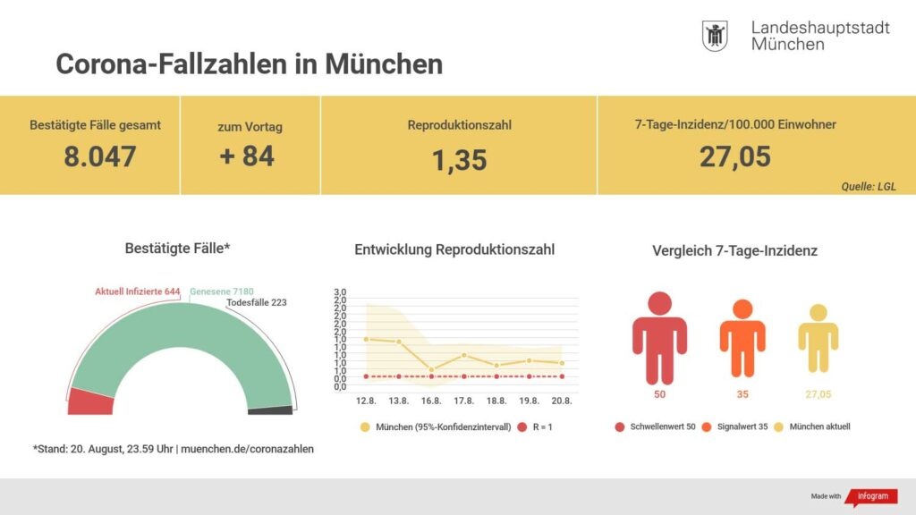 In München wurden für Donnerstag, 20. August (Stand 23.59 Uhr), 84 neue Corona-Fälle gemeldet. Insgesamt sind in der Landeshauptstadt bislang 8.047 Infektionen bestätigt. In dieser Zahl enthalten sind 7.180 Personen, die bereits genesen sind, sowie 223 Todesfälle.