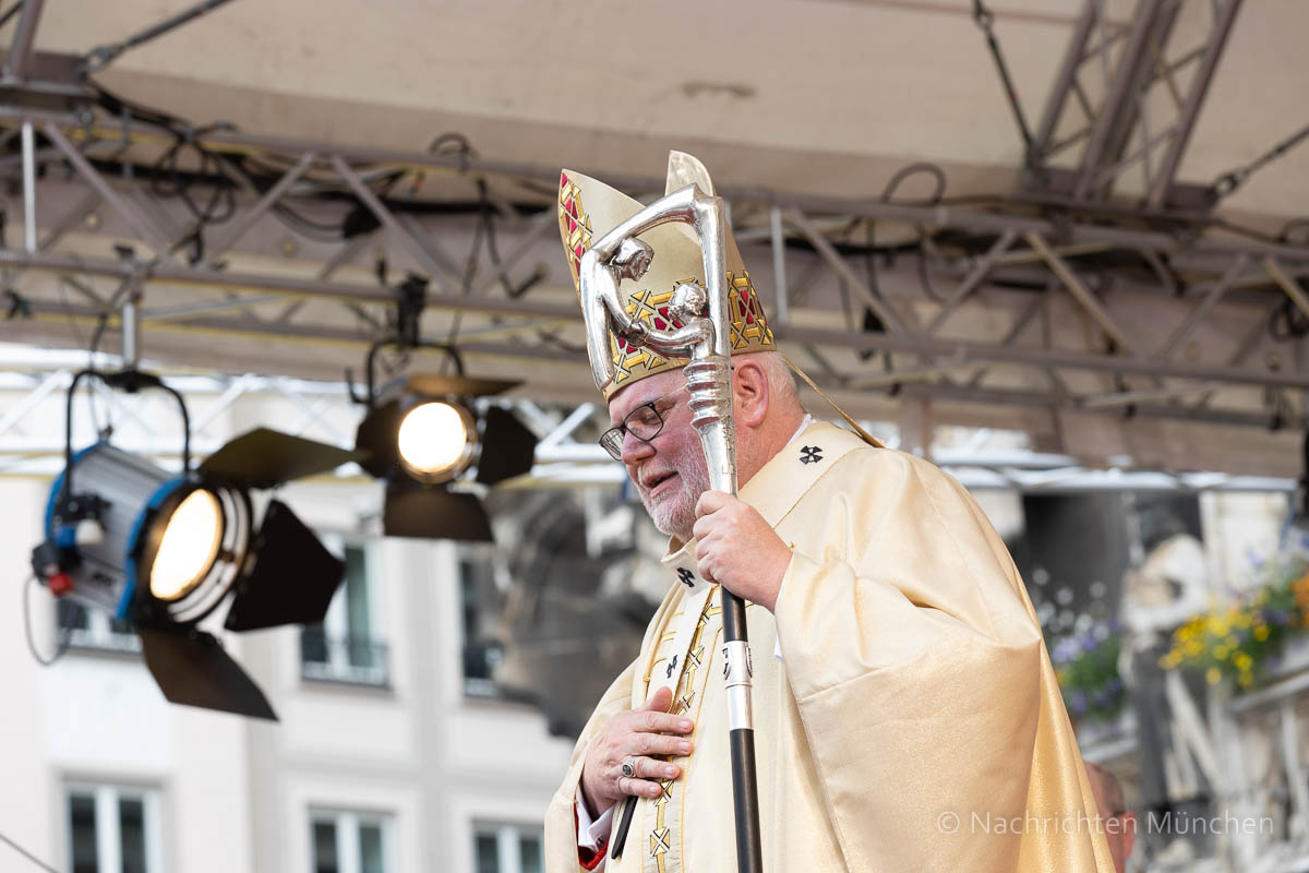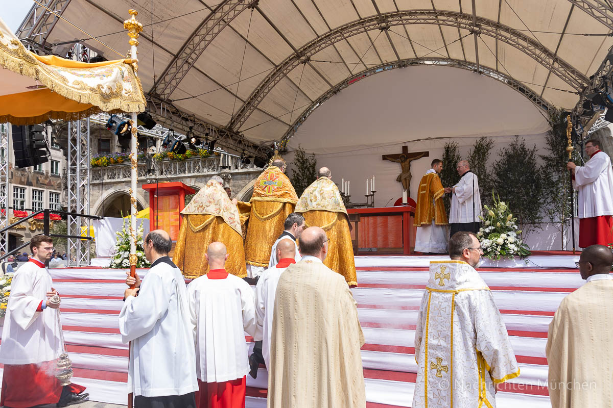 Mehr als 10.000 Menschen kamen zum Gottesdienst auf dem Münchner Marienplatz und zur anschließenden Fronleichnamsprozession, die über die Residenzstraße zur Ludwigskirche zum Segensaltar und über die Theatinerstraße zurück zum Marienplatz führte. Angeführt wurde die Prozession auf dem etwa zwei Kilometer langen Weg von einem von Jugendlichen getragenen Kreuz, begleitet unter anderem von Ordensangehörigen, Studenten, Mitarbeitern in pflegenden und pastoralen Berufen, Priestern, Diakonen und Ministranten, Vertretern von Staat und Stadt, Ordensrittern, Vertretern der katholischen Räte, von Verbänden und Trachtengruppen. Gottesdienst und Prozession wurden vom Domchor München, der Jungen Domkantorei und den Münchner Dombläsern unter der Leitung von Domkapellmeisterin Lucia Hilz und Benedikt Celler mit Motetten und Liedsätzen zu Fronleichnam musikalisch gestaltet.