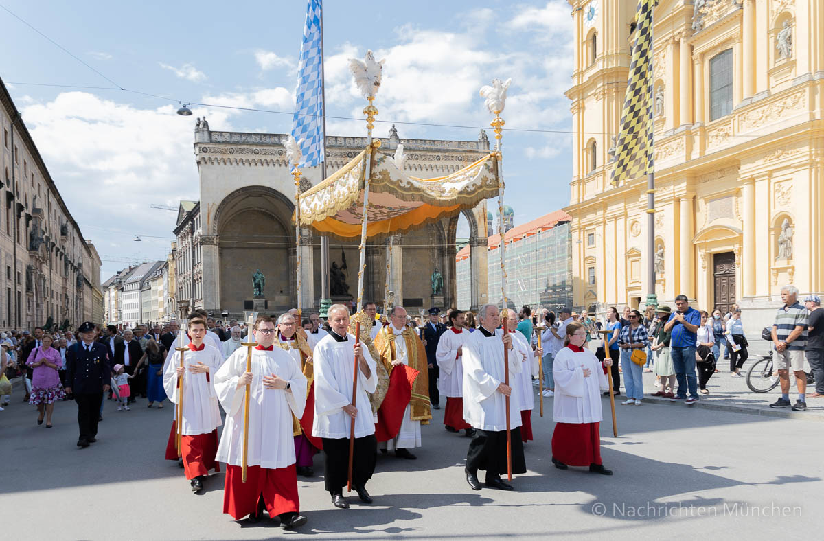 Mehr als 10.000 Menschen kamen zum Gottesdienst auf dem Münchner Marienplatz und zur anschließenden Fronleichnamsprozession, die über die Residenzstraße zur Ludwigskirche zum Segensaltar und über die Theatinerstraße zurück zum Marienplatz führte. Angeführt wurde die Prozession auf dem etwa zwei Kilometer langen Weg von einem von Jugendlichen getragenen Kreuz, begleitet unter anderem von Ordensangehörigen, Studenten, Mitarbeitern in pflegenden und pastoralen Berufen, Priestern, Diakonen und Ministranten, Vertretern von Staat und Stadt, Ordensrittern, Vertretern der katholischen Räte, von Verbänden und Trachtengruppen. Gottesdienst und Prozession wurden vom Domchor München, der Jungen Domkantorei und den Münchner Dombläsern unter der Leitung von Domkapellmeisterin Lucia Hilz und Benedikt Celler mit Motetten und Liedsätzen zu Fronleichnam musikalisch gestaltet.
