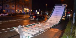 PKW rammt Brücke und schleift Planendach hinter sich her